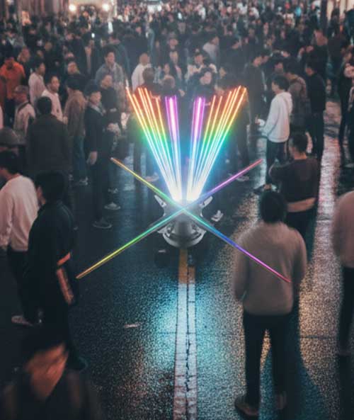 Sahneye fütüristik 3D derinlik katıp havada asılı görsel şölen sunar.